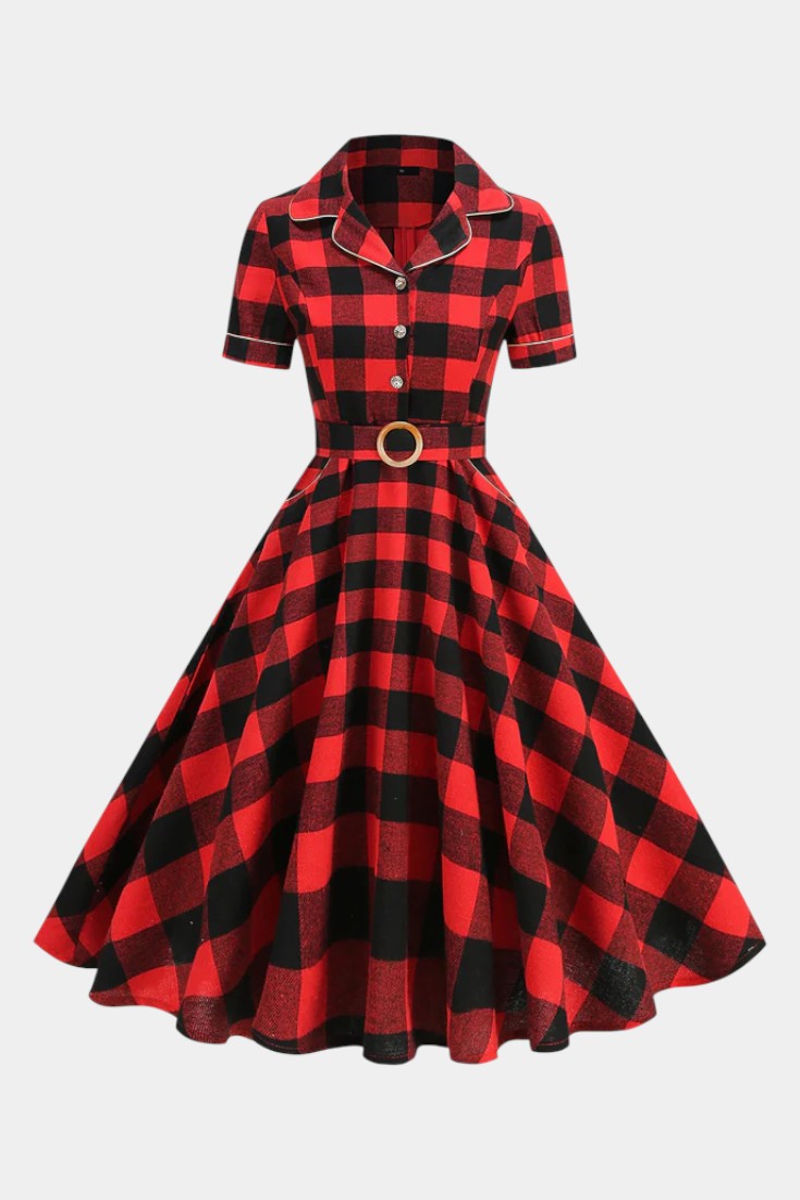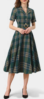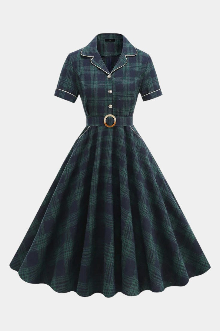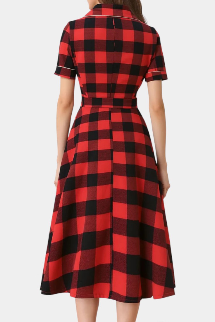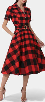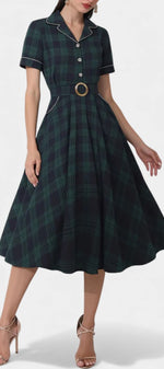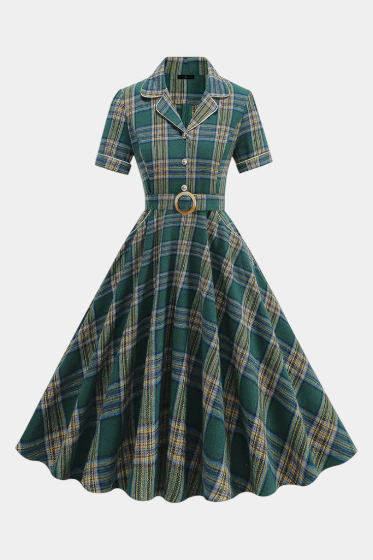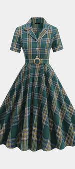 Lylas Robe Midi Vintage à Carreaux avec Revers Tailleur, Poches et Ceinture