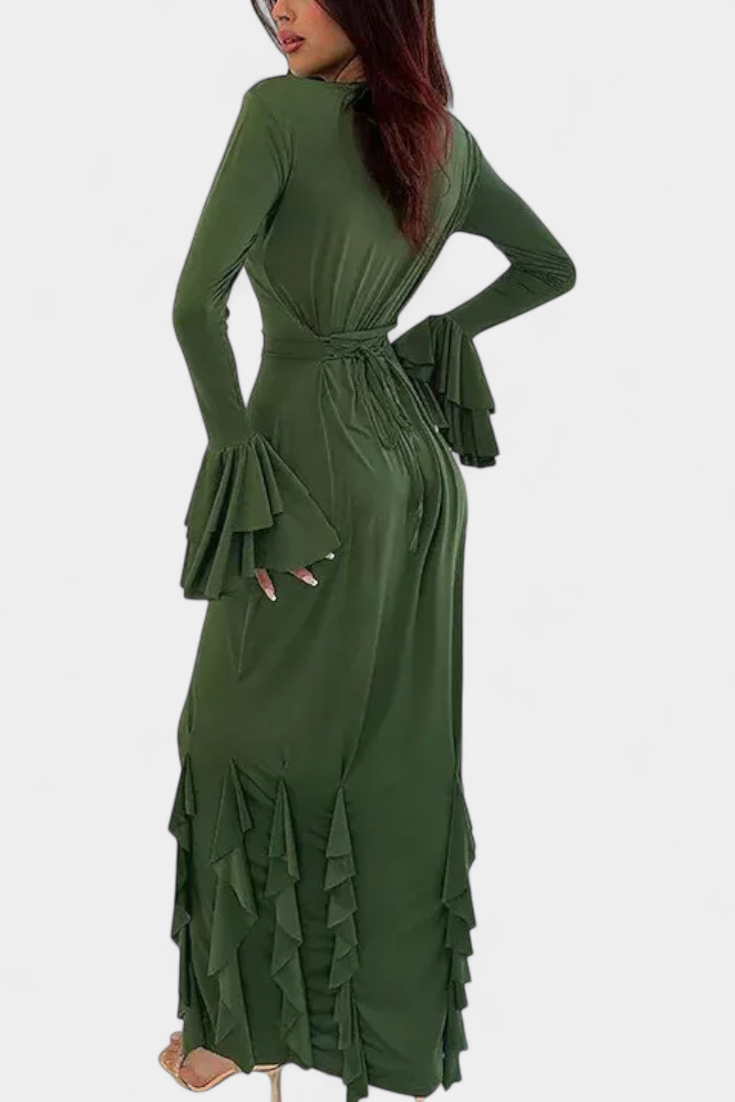 Calissa Robe Longue Ajustée à Manches Évasées et Volants en Cascade