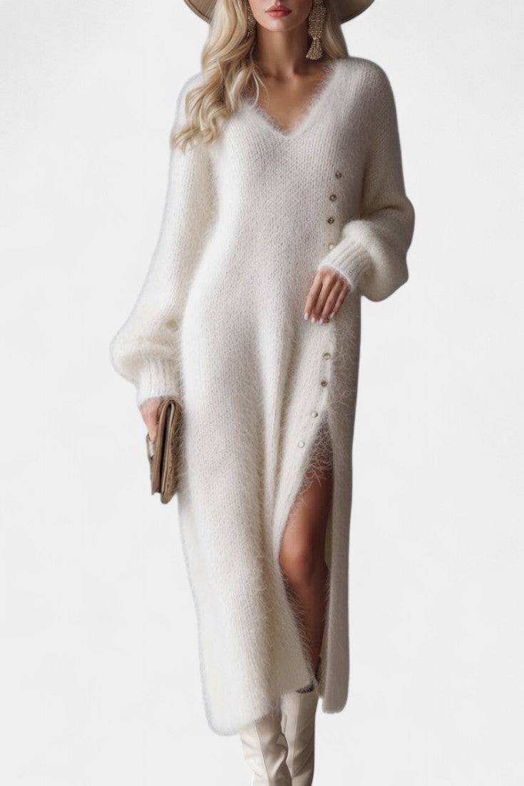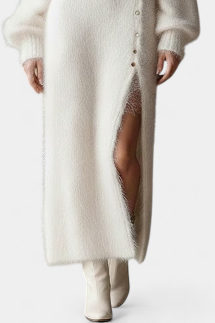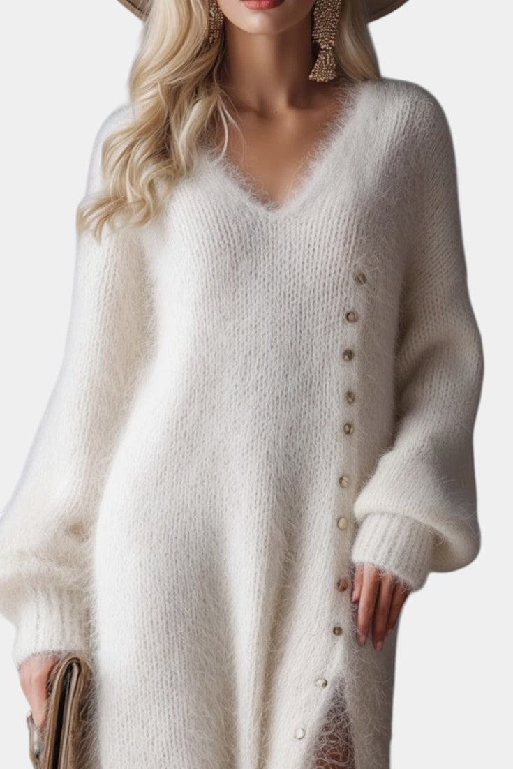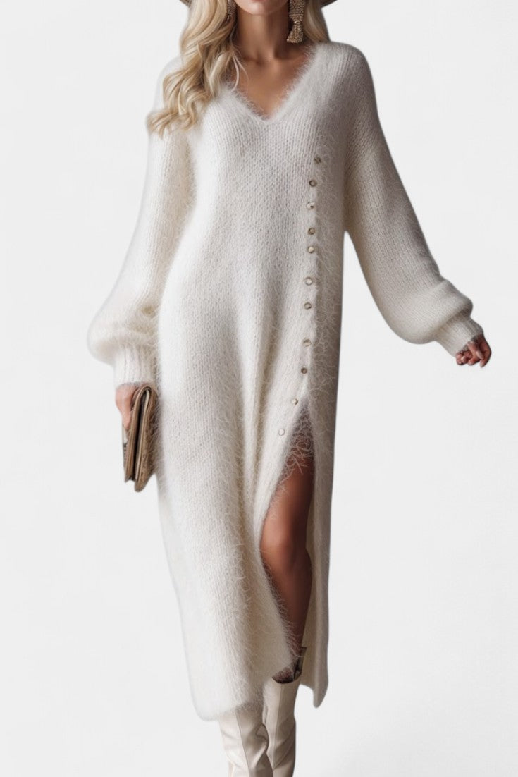 Méthilde Robe Midi Tricotée en Fourrure à Boutons Métalliques