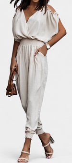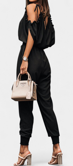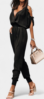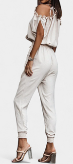 Décontractée, flatteuse et avec une touche coquette, la combinaison Solene associe un décolleté en V croisé à des épaules nues et des nœuds délicats pour un look décontracté mais soigné. Sa taille élastique définit la silhouette avec naturel, tandis que l'ourlet ajusté équilibre le volume supérieur pour une esthétique casual-chic parfaite au quotidien.
