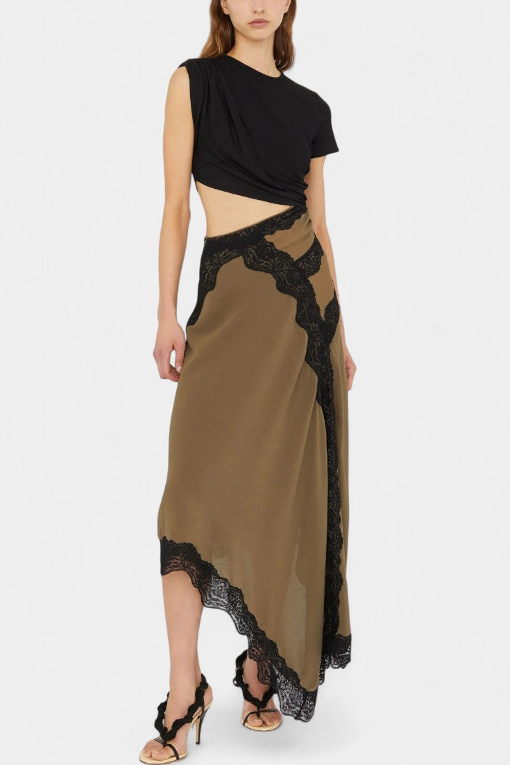 Mirren Ensemble Satiné à Dentelle Contrastante et Jupe Midi Fluide