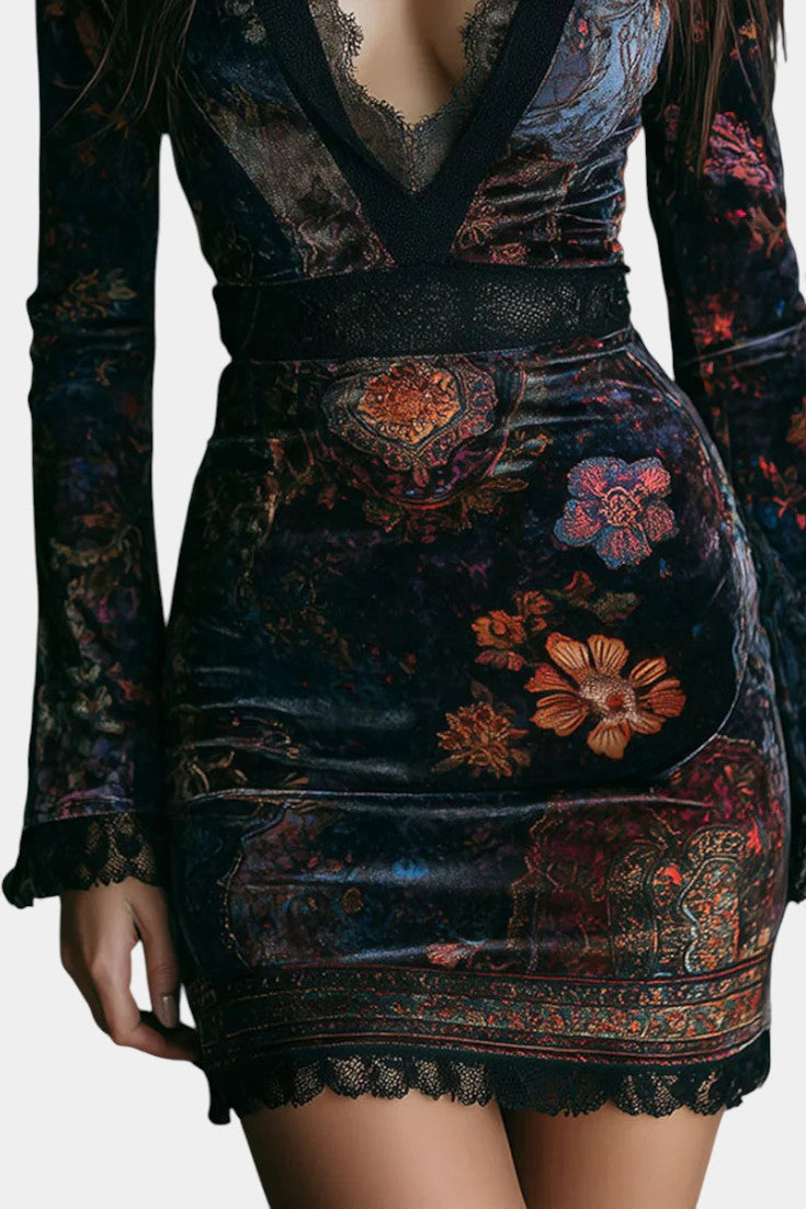 Maxine Robe Mini Slim Fit en Velours Floral avec Dentelle