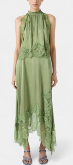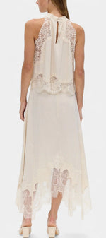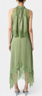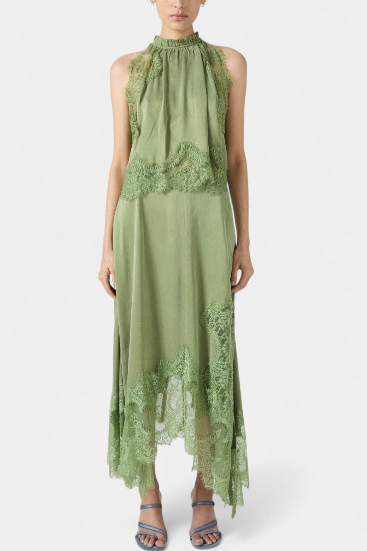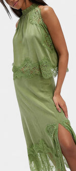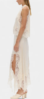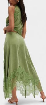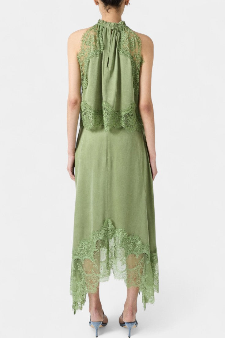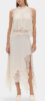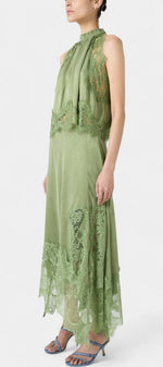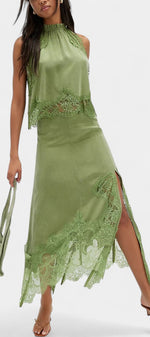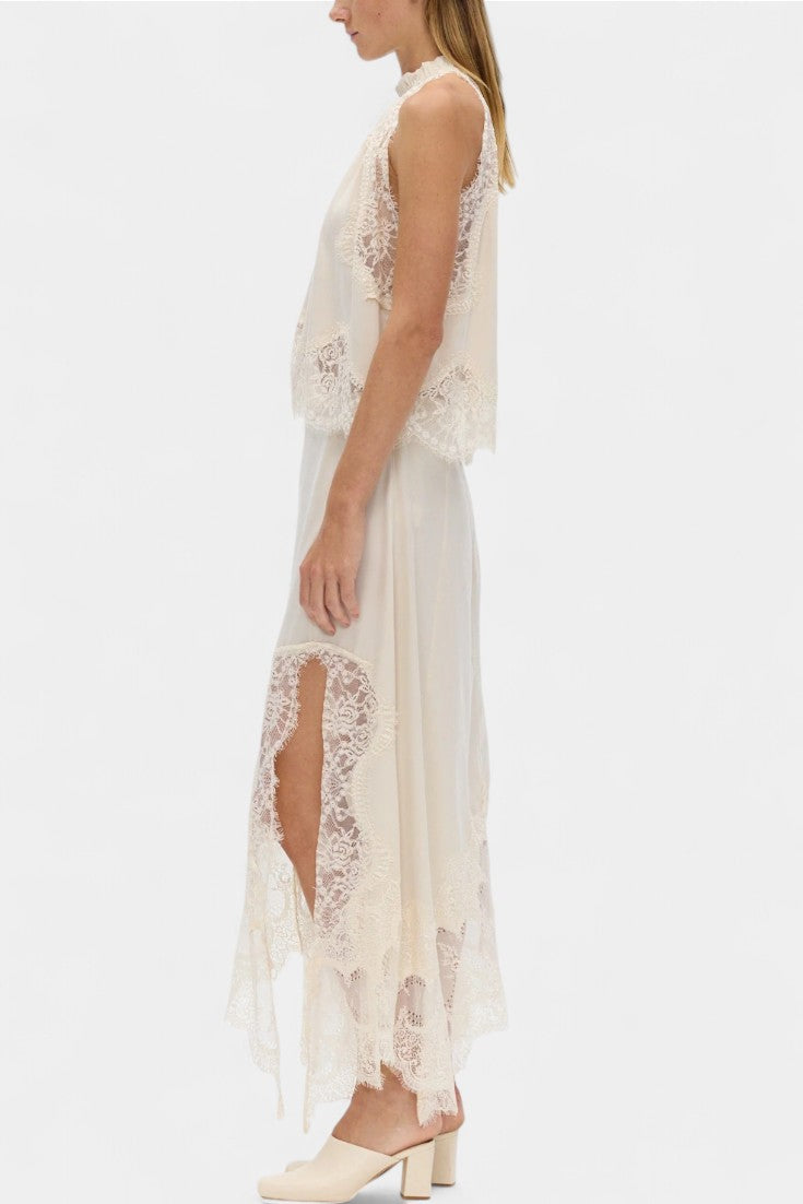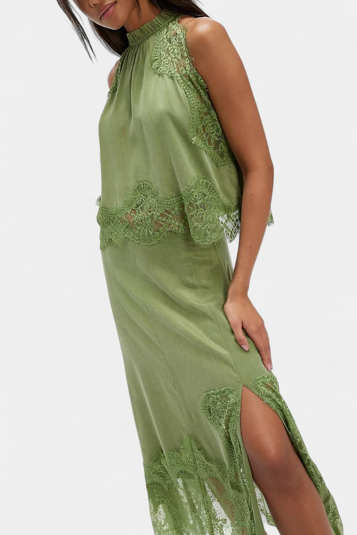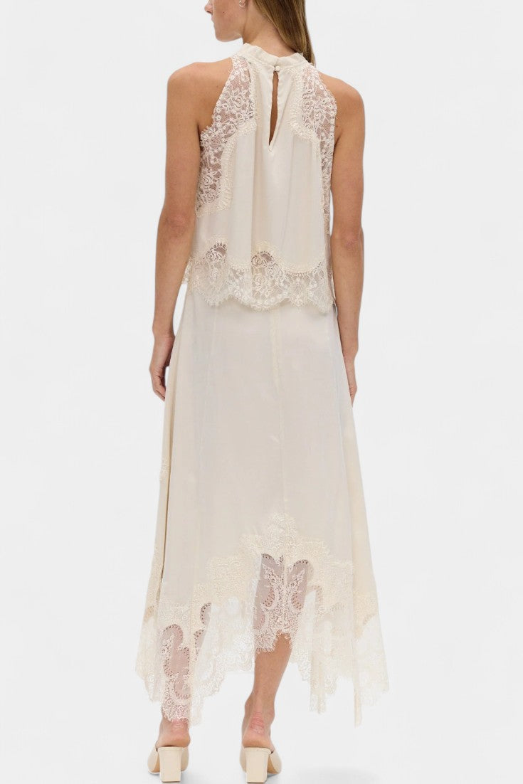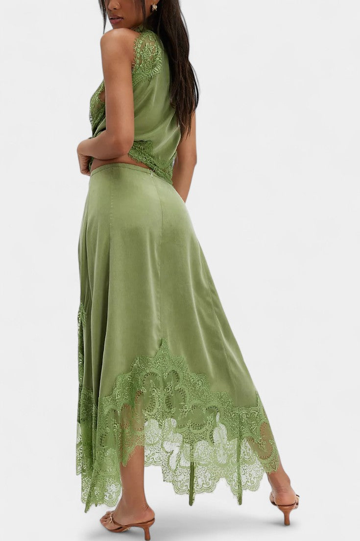 Un ensemble qui irradie mouvement, fraîcheur et sophistication intemporelle. Coralena combine une jupe midi avec de délicats panneaux en dentelle et un ourlet asymétrique qui apporte fluidité à chaque pas, accompagné d'un top coordonné qui équilibre élégance et modernité.