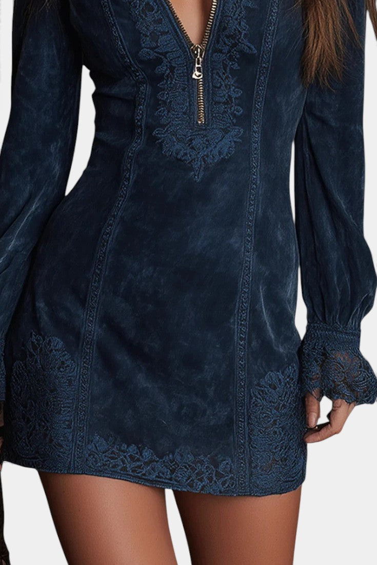 Vania Robe Mini Sculptée à Col Zippé et Motifs Ornementaux