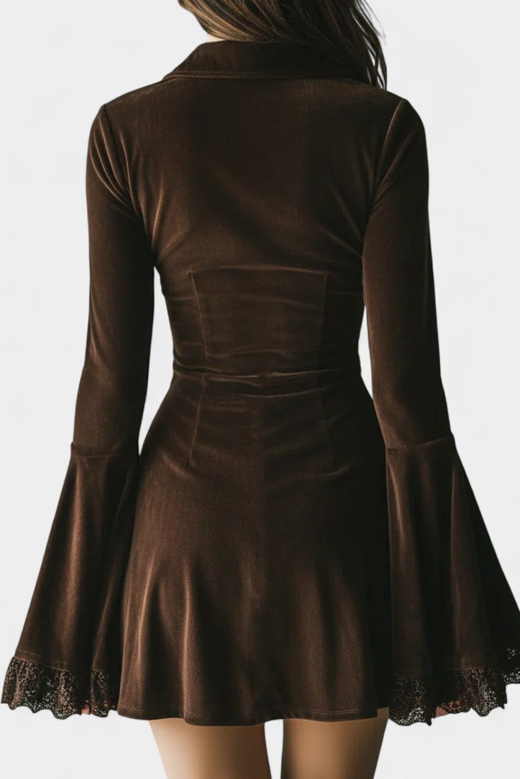 Ellora Robe Mini Ajustée en Velours Chocolat avec Ourlet en Dentelle