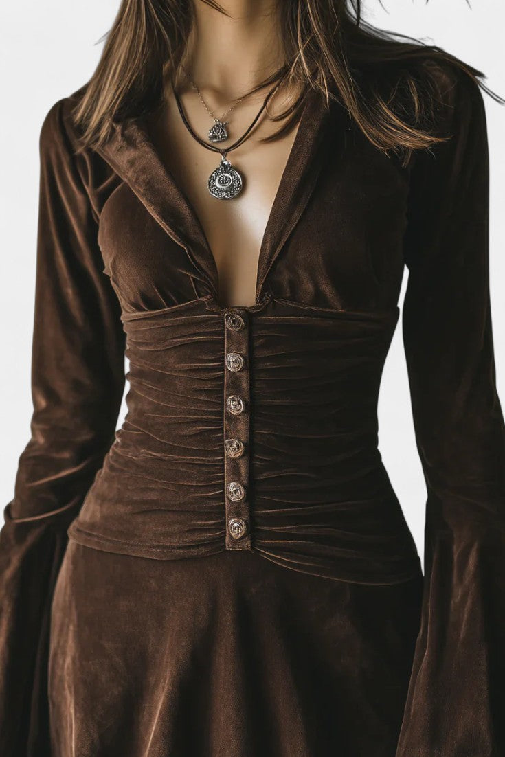 Ilonka Robe Mini en Velours avec Boutons et Dentelle Vintage