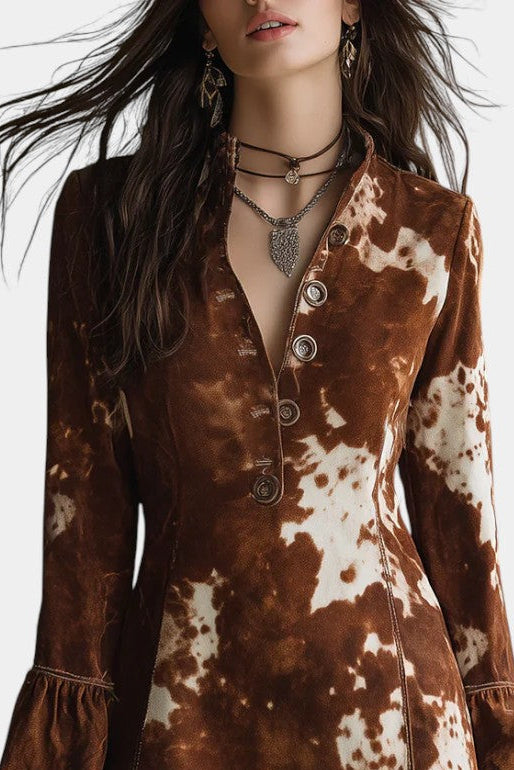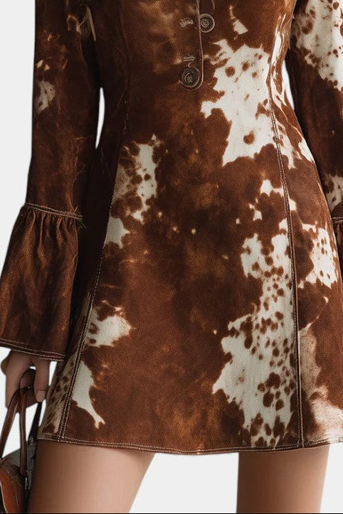 Nectarie Robe Mini Rétro à Manches Évasées et Imprimé Vache
