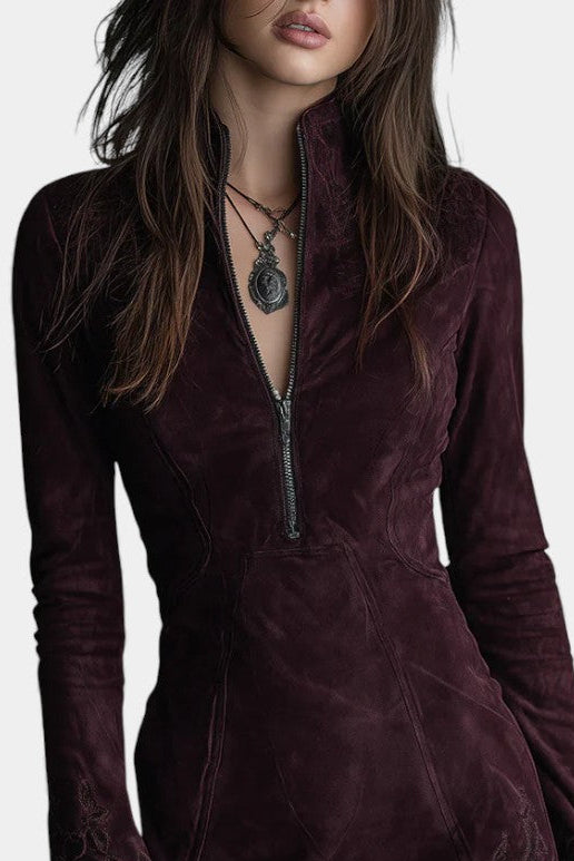 Solveig Robe Mini en Suède Marron à Col Roulé et Fermeture Éclair