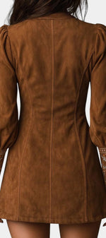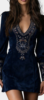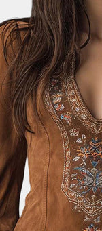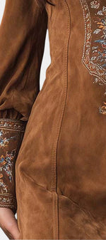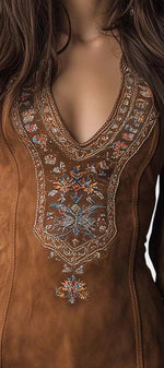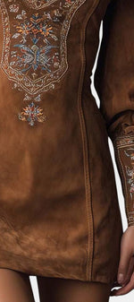 Une robe qui évoque une élégance bohème maîtrisée, entre innovation artisanale et allure contemporaine. Anceline se distingue par sa suédine marron douce au toucher, sublimée par des motifs floraux imprimés en 3D au décolleté et aux poignets. Son décolleté en V profond et ses coutures structurées dessinent une silhouette flatteuse, tandis que les manches longues légèrement bouffantes apportent caractère et féminité.