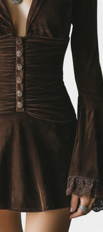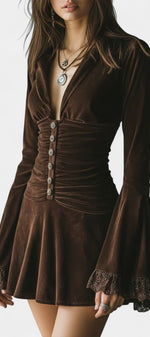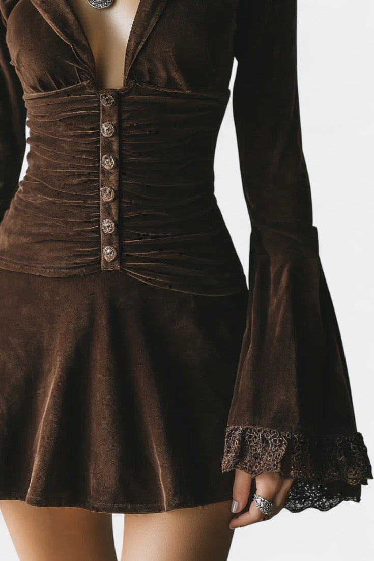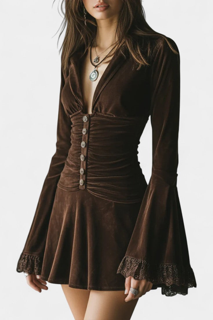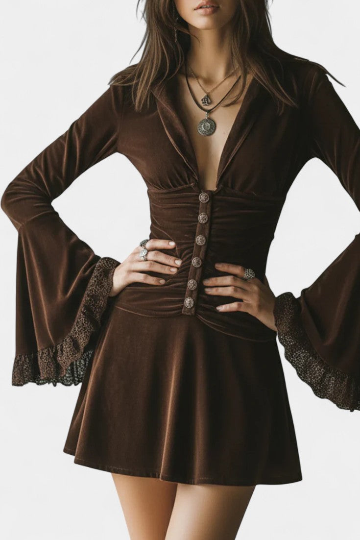 Érika Robe Courte Plissée en Velours à Manches Évasées en Dentelle