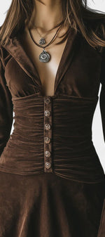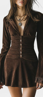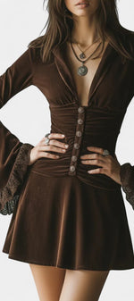 À la fois rétro et résolument féminine, la robe Érika séduit par son élégance singulière et son charme vintage assumé. Confectionnée dans un velours marron foncé à la texture douce et subtilement lumineuse, elle offre une allure raffinée tout en restant facile à porter. Sa coupe courte plissée apporte du mouvement et de la légèreté, tandis que les boutons décoratifs soulignent son inspiration rétro. Les manches évasées en dentelle ajoutent une touche délicate et sophistiquée, créant un contraste élégant entre structure et transparence. Une pièce idéale pour affirmer son style avec caractère et douceur.