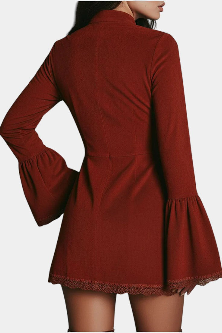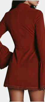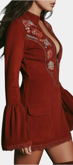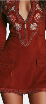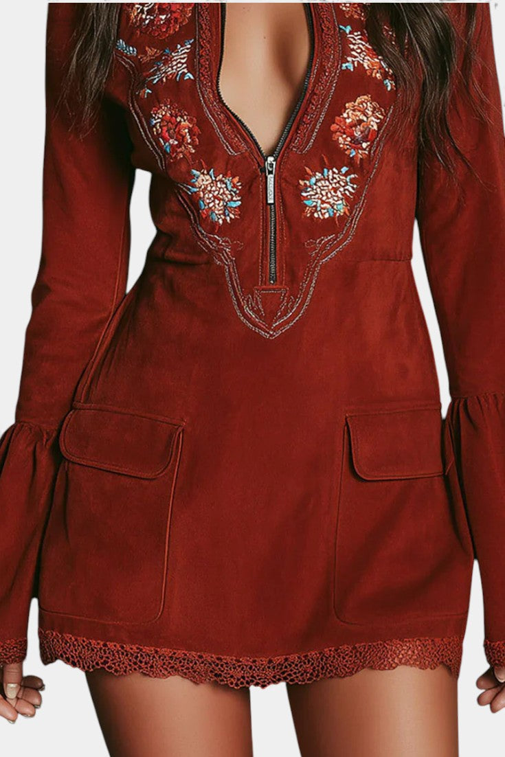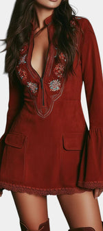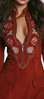 Vicenta Robe Mini en Suédine Brodée Rouge Rouille à Manches Évasées