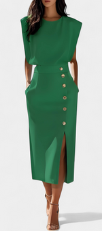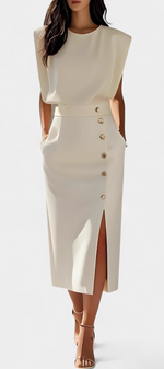 Épurée et fonctionnelle, la robe Ceecee combine un design aux lignes nettes avec des détails subtils qui élèvent le look. Confectionnée dans une couleur unie et ornée de boutons décoratifs et d'une poche pratique, c'est une pièce polyvalente qui passe facilement du bureau à des événements plus formels.