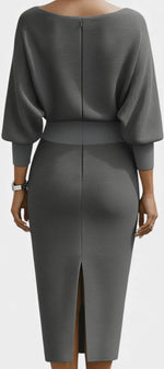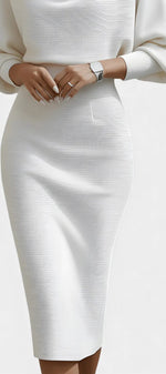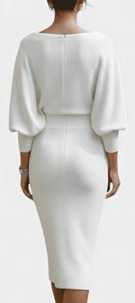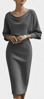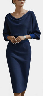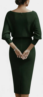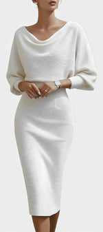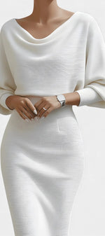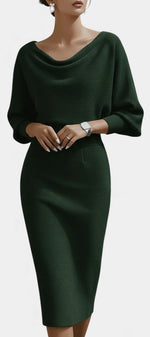 Épure, mouvement et allure sculptée : la robe Marjolaine incarne une élégance minimaliste qui ne passe jamais inaperçue. Son décolleté drapé encadre délicatement la clavicule, tandis que les manches chauve-souris créent un volume fluide et maîtrisé. La taille cintrée se fond dans une jupe crayon midi ajustée, dessinant une silhouette féminine et équilibrée qui allie grâce et modernité.
