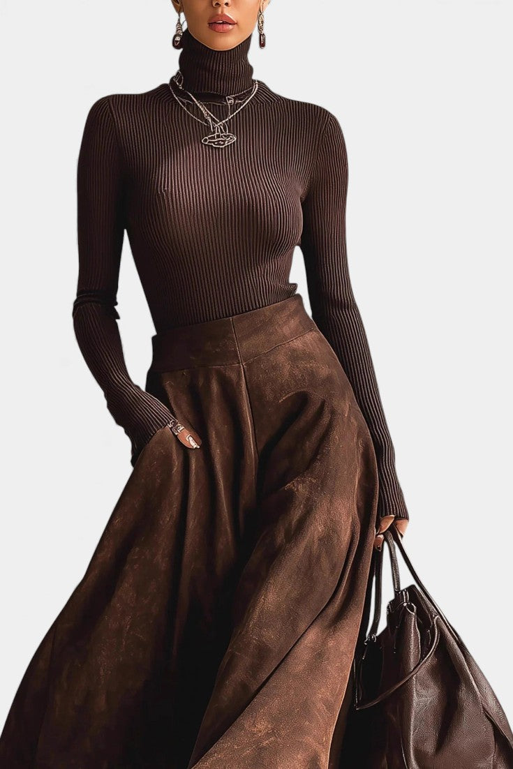 Fabia Ensemble Col Roulé Marron Foncé et Jupe en Velours Côtelé