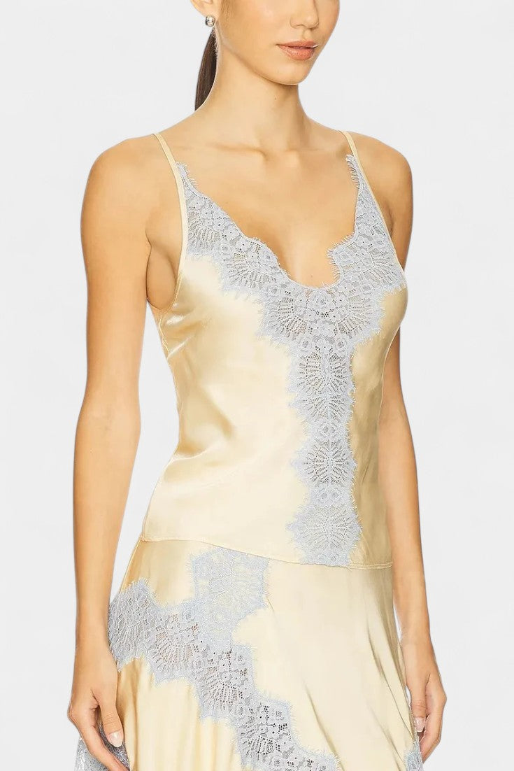 Mirren Ensemble Satiné à Dentelle Contrastante et Jupe Midi Fluide