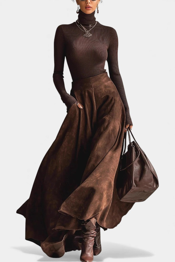 Céladorée Ensemble Col Roulé Chocolat & Jupe Maxi en Suédin