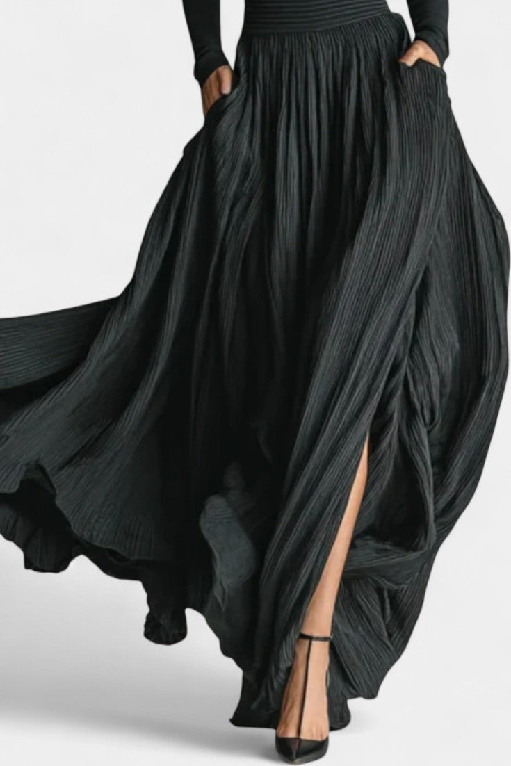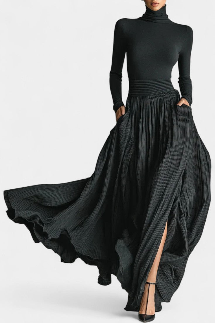 Selara Ensemble Noir à Col Montant et Jupe Plissée Fluide