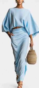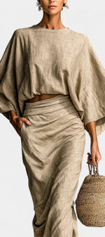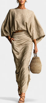 Marlon incarne la simplicité élégante et le confort raffiné. Composé d’un top à manches longues à la coupe décontractée et d’une jupe fluide, cet ensemble allie légèreté et mouvement naturel. Sa texture douce et respirante en fait une tenue idéale pour traverser la journée avec aisance, tout en conservant une allure sophistiquée et intemporelle.