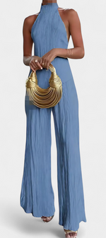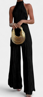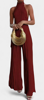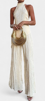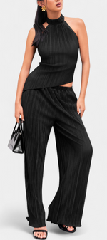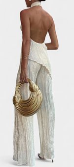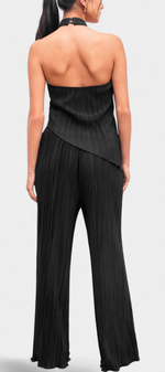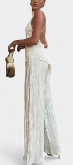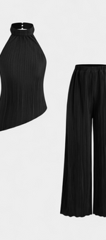 Minimalisme architectural avec texture et mouvement. L'ensemble Pilarica allie un top halter à coupe asymétrique et dos nu avec des pantalons à jambes larges, créant une silhouette allongée avec caractère. Son tissu plissé avec un subtil éclat ajoute dimension et élégance moderne.