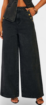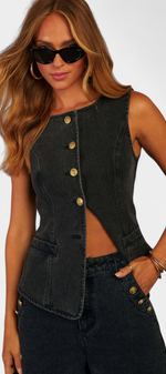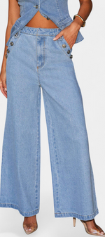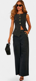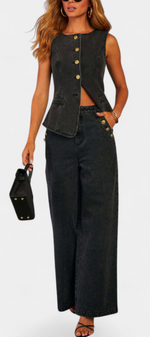 L'ensemble Ludovica redéfinit le denim avec une touche sophistiquée. Le gilet ajusté sans manches épouse la silhouette avec élégance grâce à sa fermeture à boutons, tandis que les jeans à jambes larges et taille haute apportent confort et un look décontracté et tendance. Parfait pour allier style urbain et féminité affirmée.