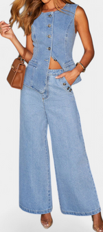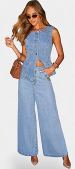 Ludovica Ensemble Denim avec Gilet Ajusté Sans Manches et Jeans à Jambes Larges