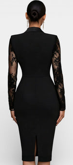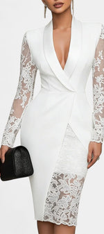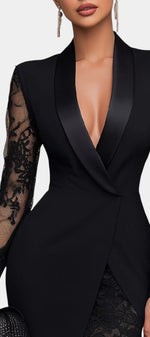 Puissante et sensuelle à la fois, la robe Anelle réinterprète le vestiaire tailleur avec une féminité assumée. Son col structuré inspiré du blazer, souligné par une finition satinée, encadre un décolleté en V plongeant qui apporte caractère et sophistication. Les manches longues mêlent dentelle florale et transparence subtile, créant un contraste raffiné avec le corsage lisse et légèrement extensible. L’ourlet asymétrique, où la ligne ajustée rencontre une jupe en dentelle délicate, donne du relief et du mouvement à la silhouette, pour une allure élégante et résolument contemporaine.