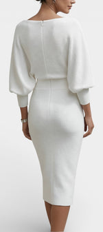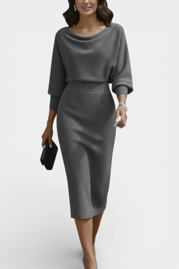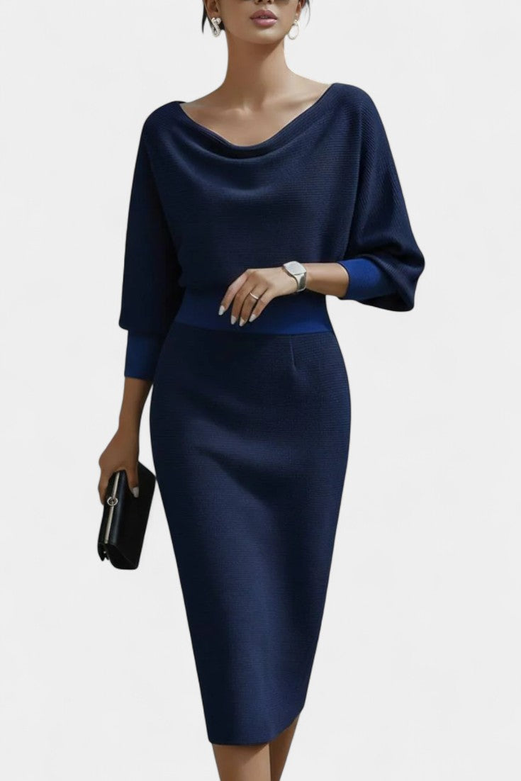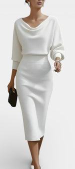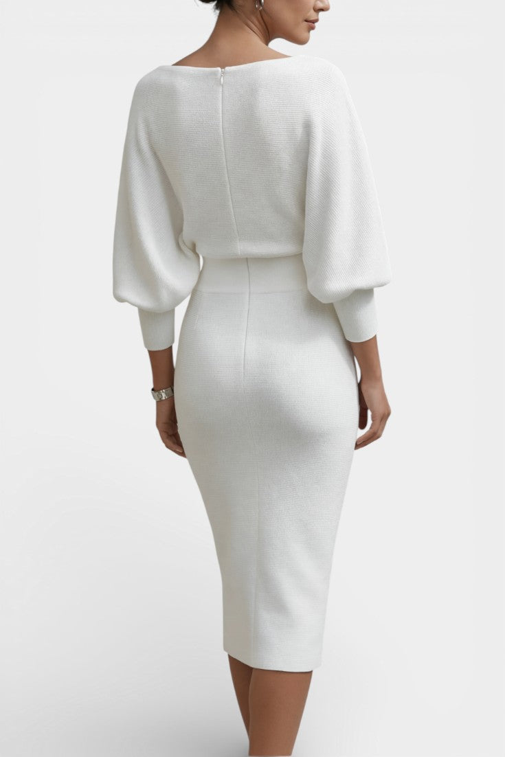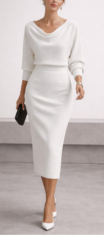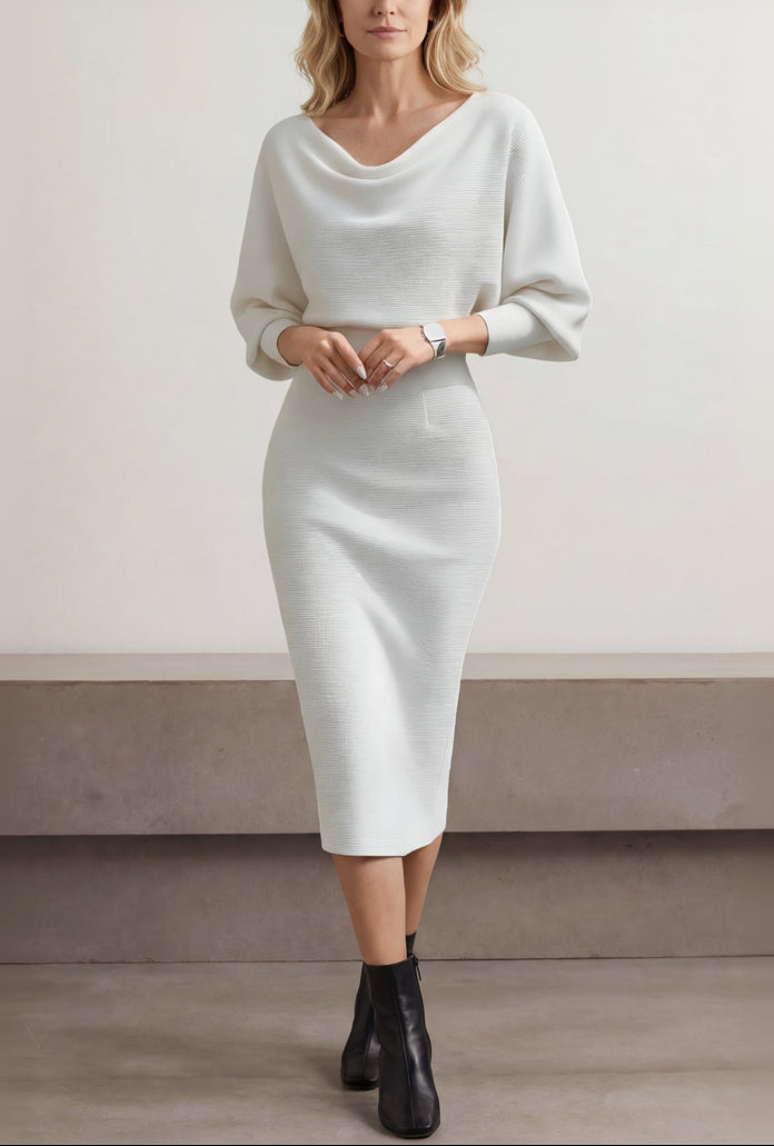 Épure, mouvement et allure sculptée : la robe Marjolaine incarne une élégance minimaliste qui ne passe jamais inaperçue. Son décolleté drapé encadre délicatement la clavicule, tandis que les manches chauve-souris créent un volume fluide et maîtrisé. La taille cintrée se fond dans une jupe crayon midi ajustée, dessinant une silhouette féminine et équilibrée qui allie grâce et modernité.