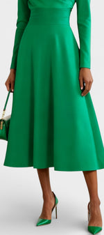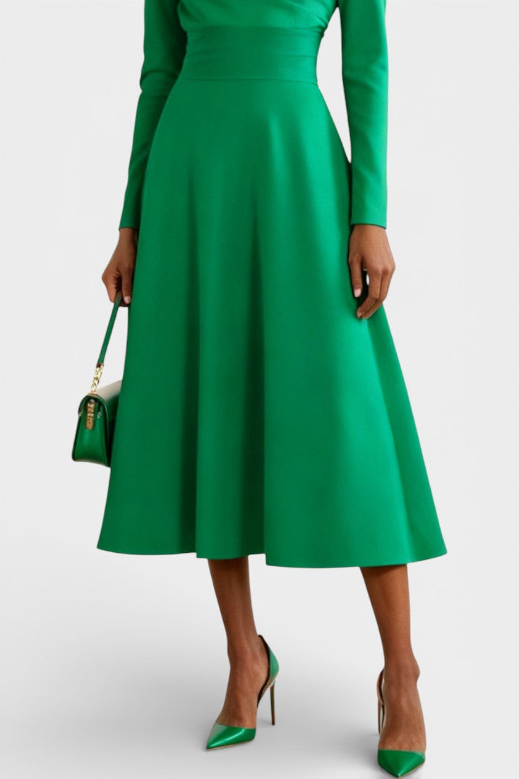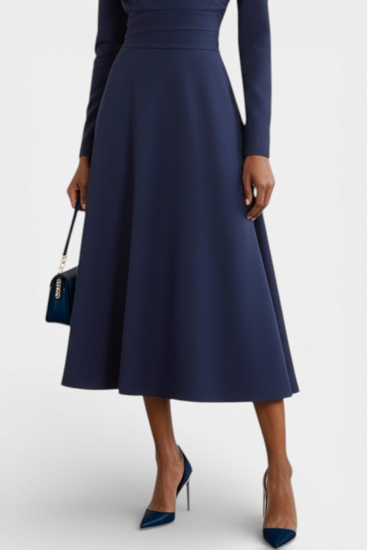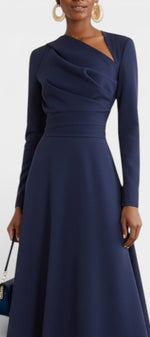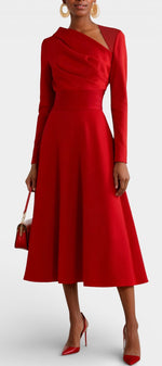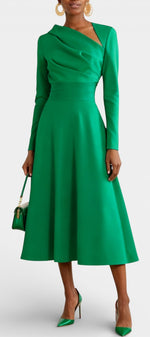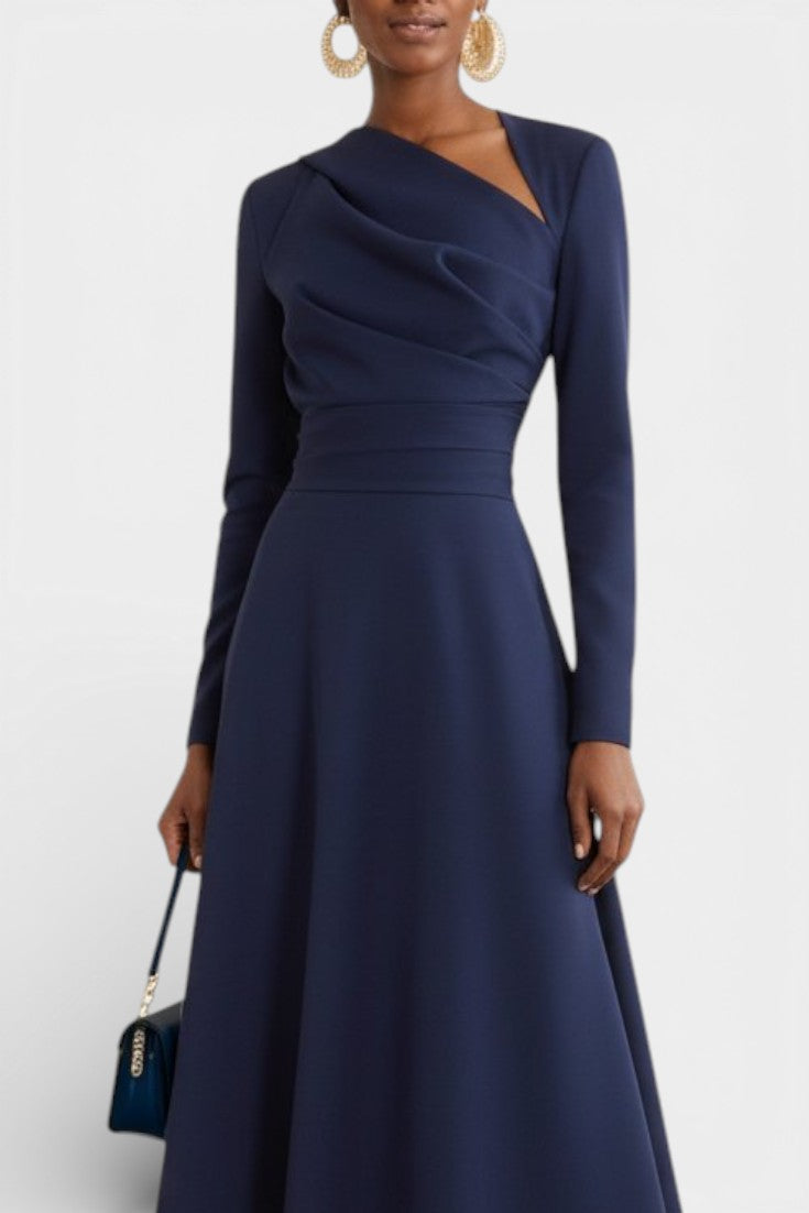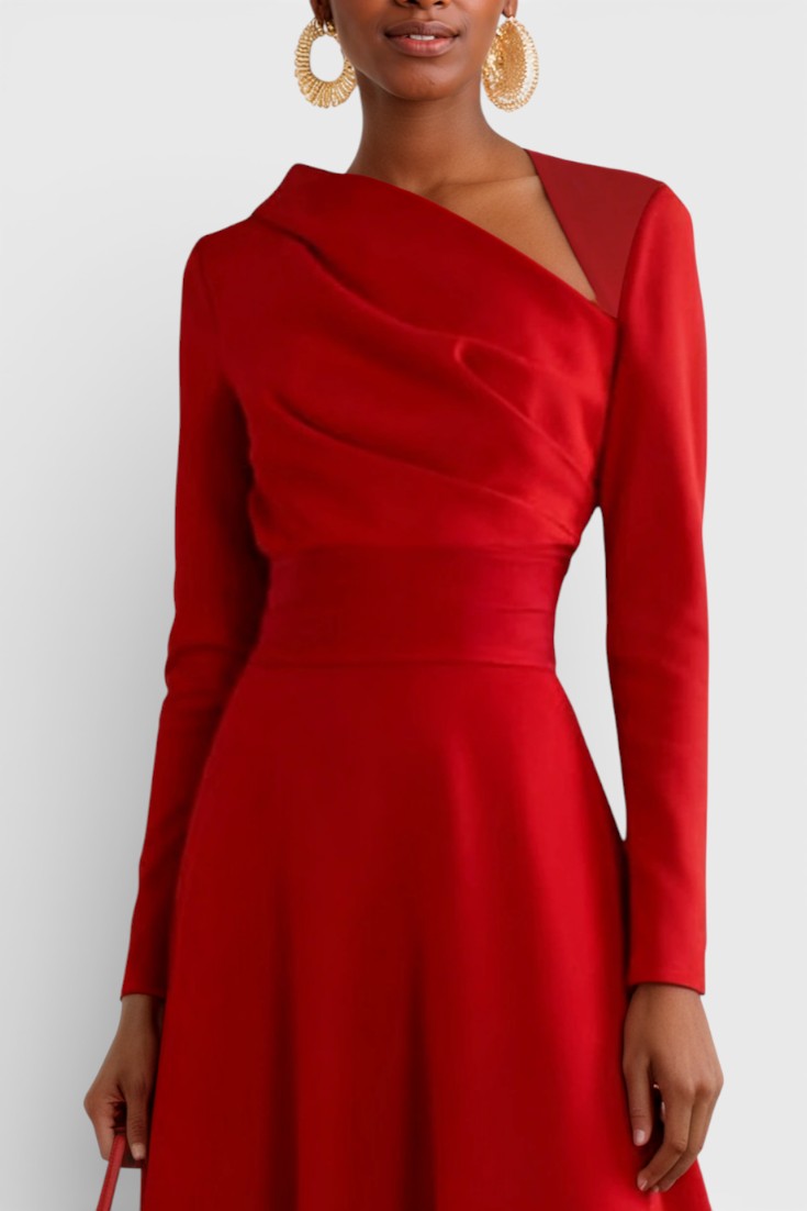 Coupe trapèze flatteuse, longueur midi élégante, manches longues structurantes, détail asymétrique au buste pour une silhouette modernisée.
