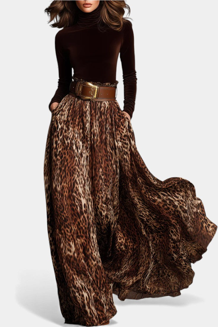 Tessaline Ensemble Col Roulé en Velours & Jupe Léopard Élégante