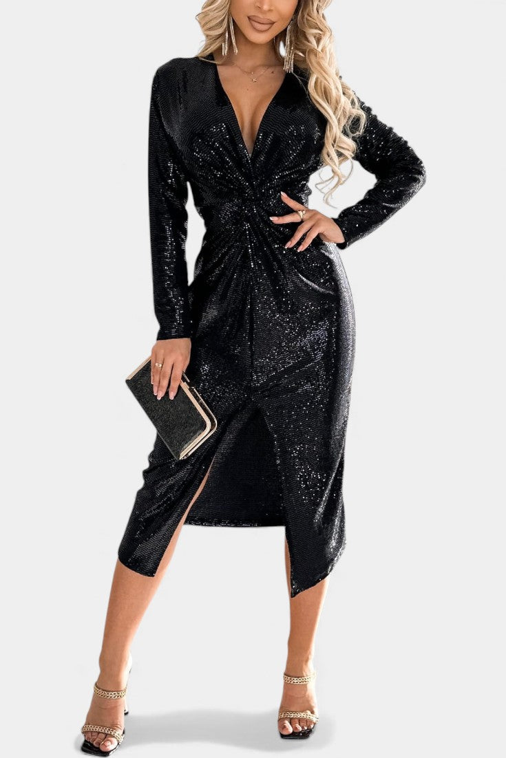 Sofina Robe Pailletée à Décolleté en V et Fente Élégante