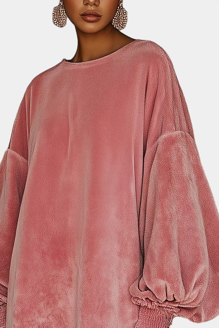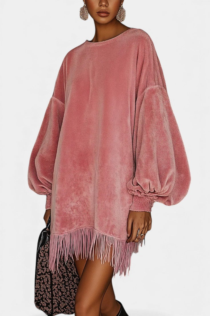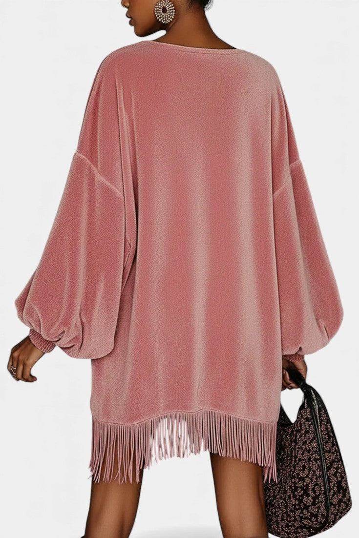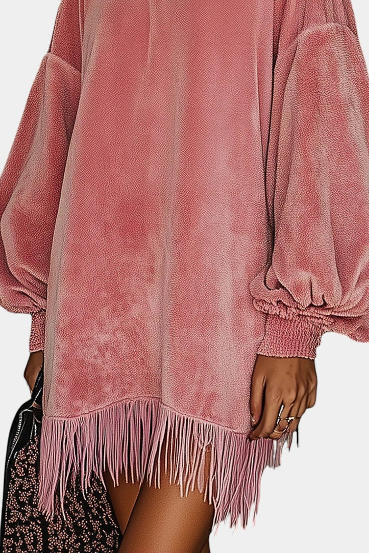 Danaë Robe Oversize en Velours Rose à Franges et Col Rond