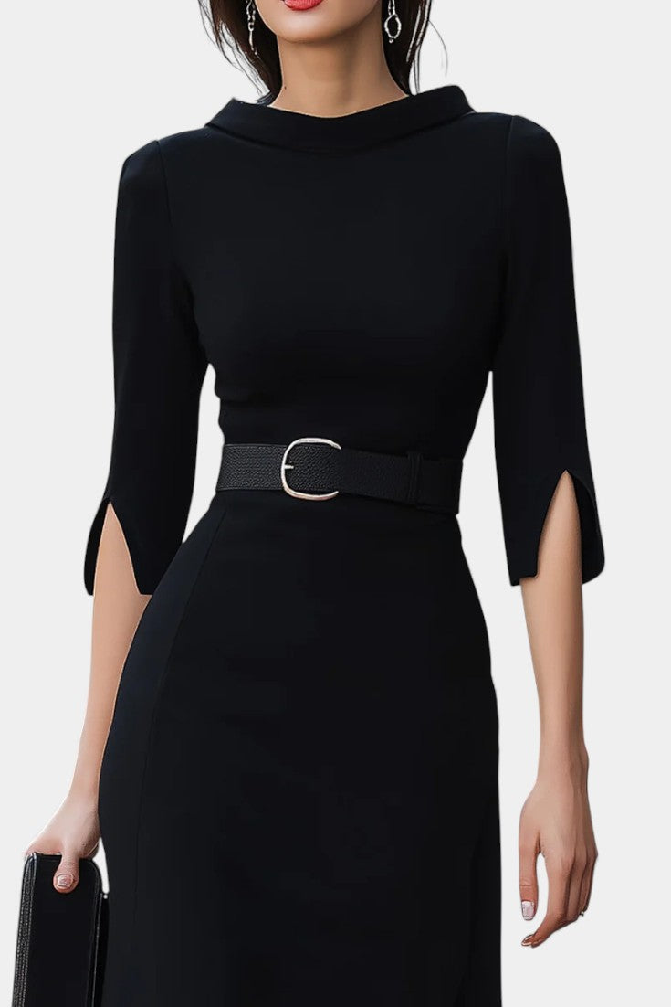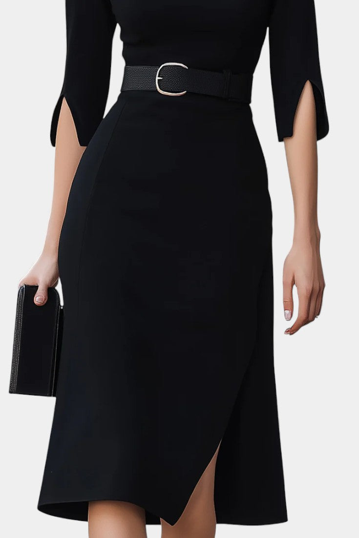 Diora Robe Midi Noire Élégante à Ceinture et Manches Fendues