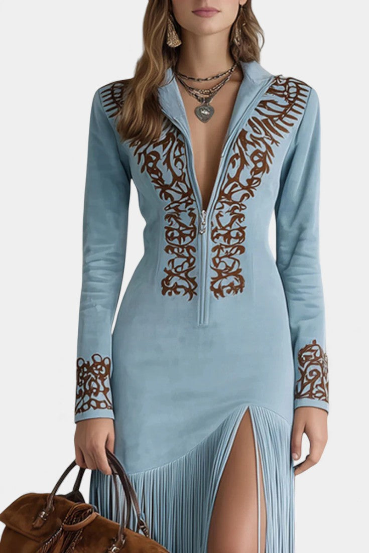 Lieselotte Robe Maxi en Suède Synthétique Brodée à Col Zippé