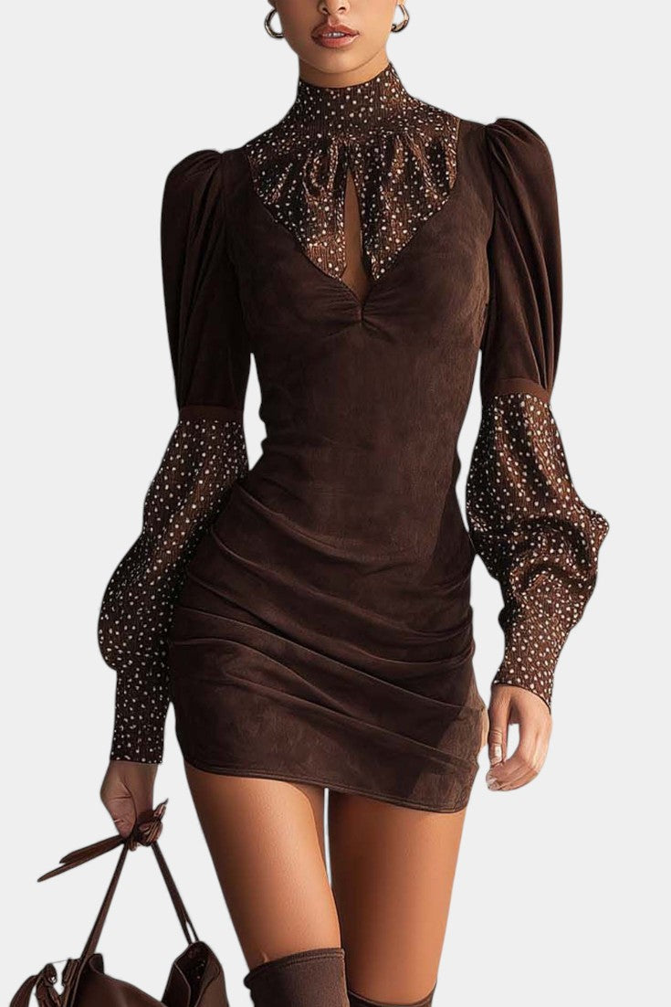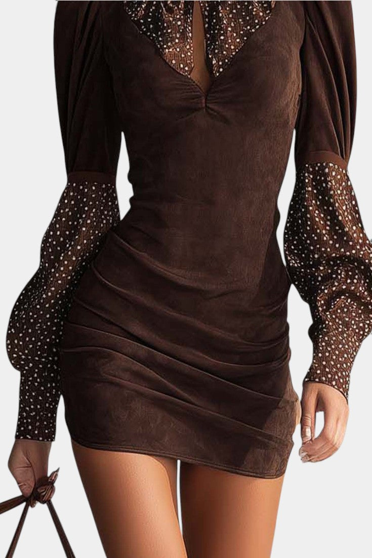 Chantaline Robe Mini en Velours Marron avec Encolure Trou de Clé et Manches en Dentelle