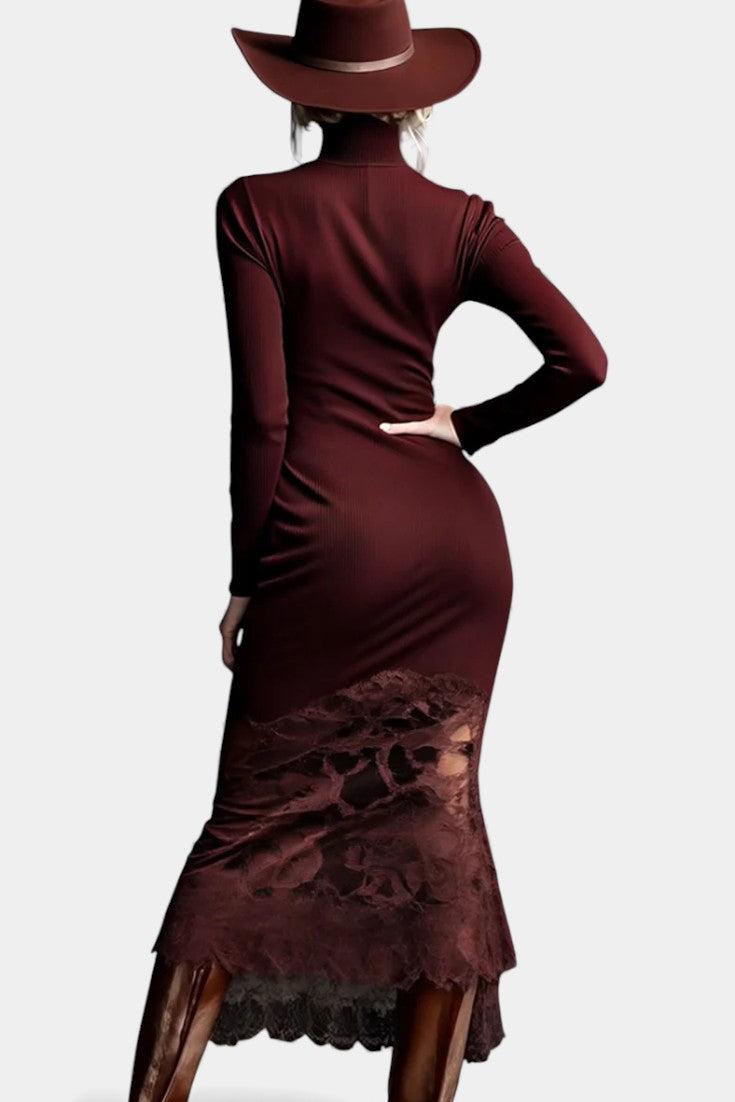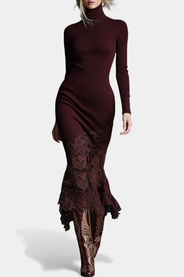 Avaria Robe Maxi Tricotée Bordeaux à Col Montant et Ourlet en Dentelle