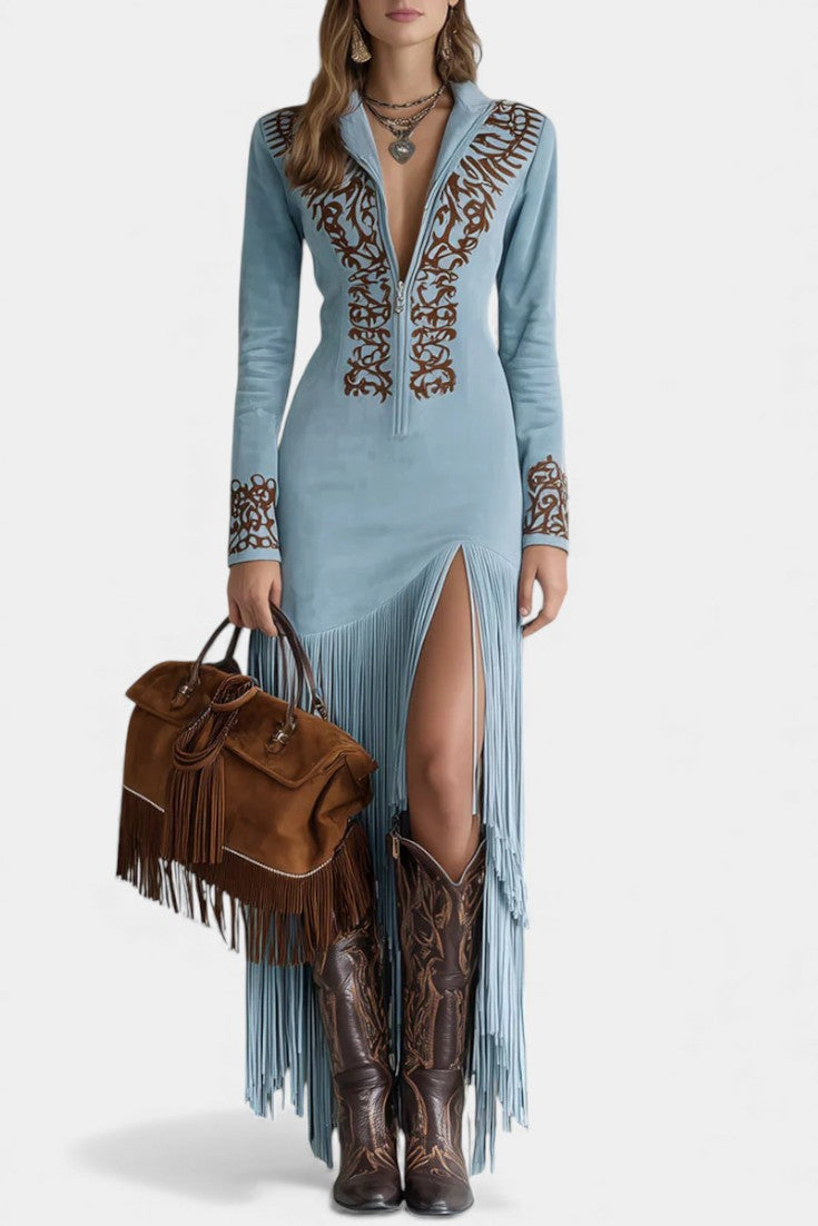 Ambre Robe Maxi en Suède Synthétique Rose Brodée avec Franges Western