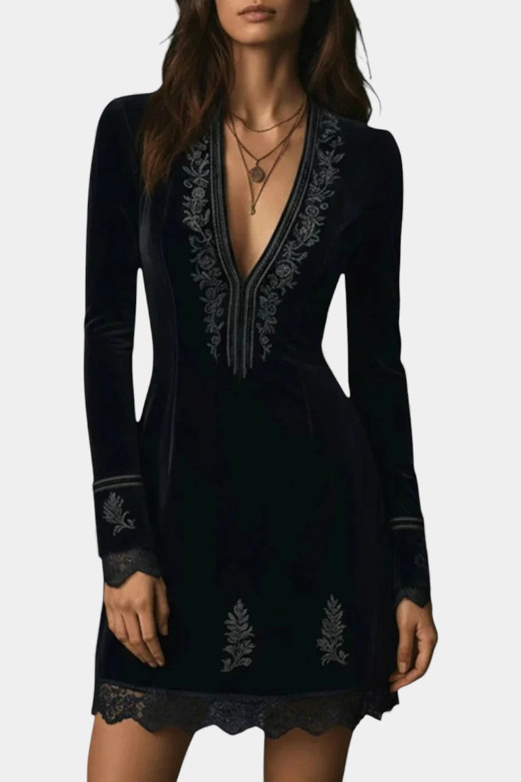 Pharélia Robe en Velours Brodé à Décolleté Profond