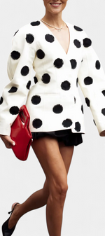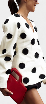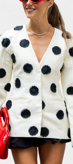 Le blazer Clara se distingue par sa texture de points bouffants en relief sur un tissu blanc impeccable, créant un effet visuel et tactile unique. Son décolleté en V modernise la silhouette, tandis que la coupe ajustée met en valeur la silhouette avec distinction. Polyvalent et accrocheur, c'est le vêtement parfait pour élever n'importe quel look avec une élégance intemporelle.