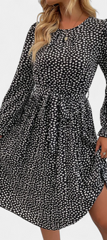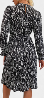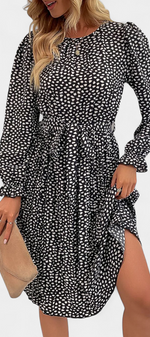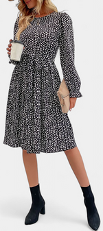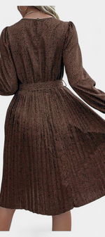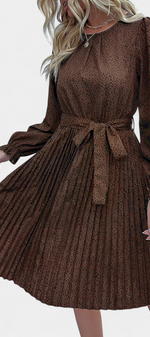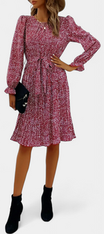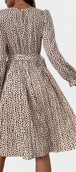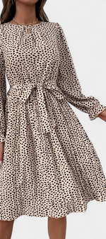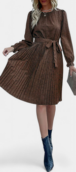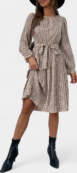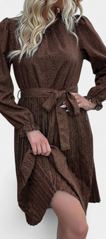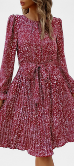 Une proposition audacieuse avec une touche raffinée. Evabeth se démarque avec un imprimé léopard qui apporte force et personnalité, équilibré par un col rond classique et des manches longues qui ajoutent de la sobriété. Sa jupe plissée s'écoule avec grâce, créant un contraste parfait entre dynamisme et élégance.