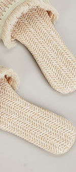 Cliente Mahaute Paris portant une robe en maille beige chez elle