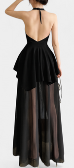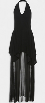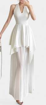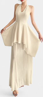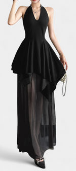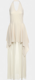 Une silhouette sensuelle qui allie fraîcheur et féminité contemporaine. Hollis se distingue par un décolleté en V d'inspiration française et un col halter qui affine subtilement. Le dos nu apporte une touche audacieuse, tandis que la taille avec détail en maille et le design cintré définissent la silhouette avec délicatesse.