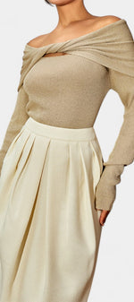 Cliente Mahaute Paris portant une robe en maille beige chez elle