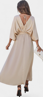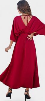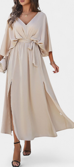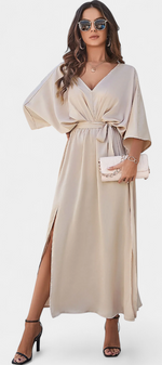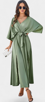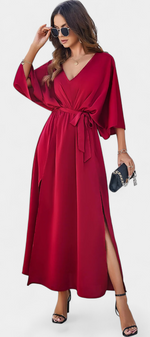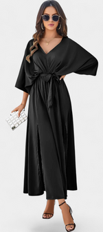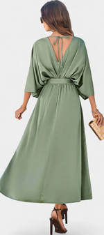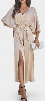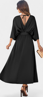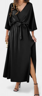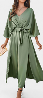 Avec un design fluide et sophistiqué, la robe Milly est la pièce parfaite pour se démarquer avec élégance sans effort. Son décolleté en V met subtilement en valeur, tandis que les manches chauve-souris et le nœud à la taille créent un équilibre entre confort et style raffiné. La fente latérale ajoute du mouvement et une touche séduisante qui transforme chaque pas en une déclaration de confiance.
