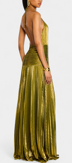 Glamour sculptural avec une énergie magnétique. La robe Emma éblouit avec sa finition métallique en ton péridot et une silhouette qui s'écoule avec puissance et élégance. Son décolleté halter défini, son dos nu et sa fente prononcée créent un équilibre parfait entre structure et mouvement.