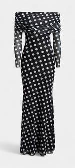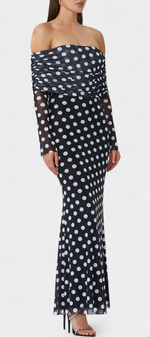 Une proposition charmante qui allie fraîcheur et style classique. Elinda se distingue par un décolleté off-shoulder qui met en valeur les épaules avec une sensualité subtile, tandis que ses manches longues équilibrent le design avec sobriété. Le motif à pois ajoute une touche intemporelle et ludique, complété par une silhouette longue qui s'écoule avec grâce.