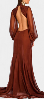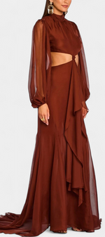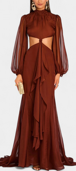 Un design qui fusionne sophistication et drame avec une élégance impeccable. La robe Delanie met en valeur la silhouette avec son col haut raffiné et le détail de découpe à la taille, tandis que les manches longues transparentes ajoutent une touche délicate et féminine. La jupe fluide avec des volants en cascade crée un mouvement hypnotique, en faisant une pièce conçue pour se démarquer à chaque pas.