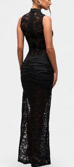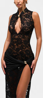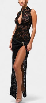 Un design captivant qui allie sensualité et sophistication. Irina éblouit avec son décolleté en forme de serrure et un col haut qui équilibre élégance et modernité. La dentelle élastique avec des détails dorés apporte une touche luxueuse, tandis que l'ouverture haute sur la cuisse ajoute une note audacieuse, parfaite pour briller lors de soirées mémorables.