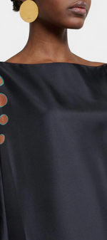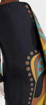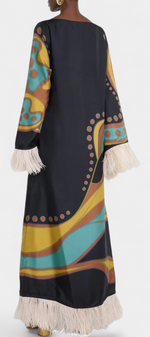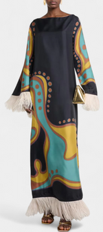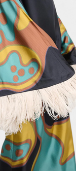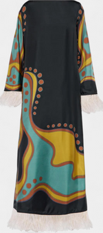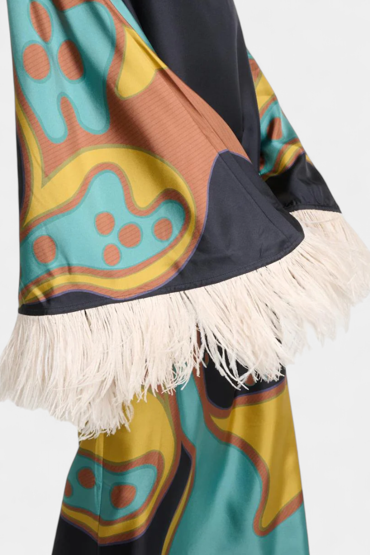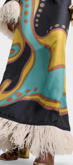 Bohémienne, audacieuse et pleine de caractère, la robe Kiara irradie un charme rétro qui ne passe pas inaperçu. Avec un imprimé vibrant dans des tons turquoise, jaune et marron, et une coupe décontractée avec un décolleté bateau, elle apporte fraîcheur et style sans effort. Les franges en plumes aux poignets et à l'ourlet ajoutent un drame ludique, créant une pièce idéale pour se démarquer en toute occasion.