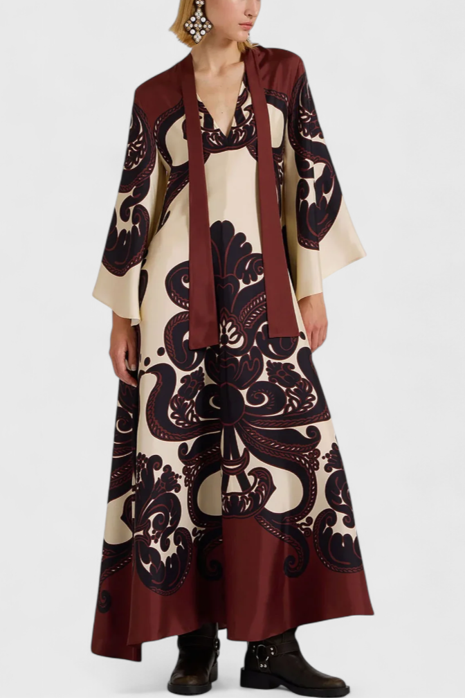 Fluidité artistique avec un design qui impose l'élégance. La robe Maritza se distingue par sa silhouette enveloppante, son col haut avec lien à l'arrière et un délicat imprimé de grenadille, créant une esthétique sophistiquée et assurée. Idéale pour les moments où le style devient protagoniste.